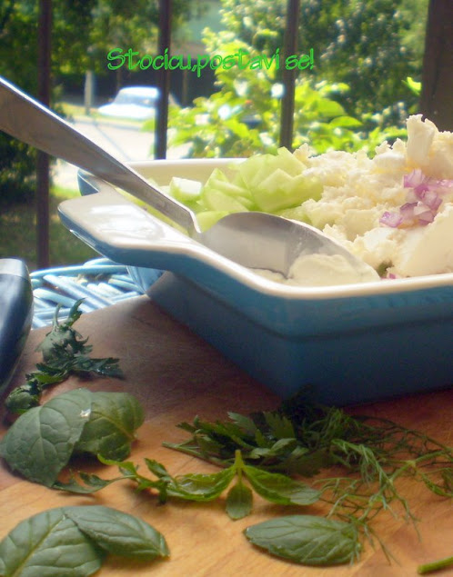 Sitno iseckati luk i krastavac, a feta sir izgnječiti. Staviti u odgovarajuću činiju i dodati kiselu pavlaku. Začiniti maslinovim uljem, limunovim sokom, biberom i sitno seckanim začinskim travama. Dobro promešati pa onda još bolje ohladiti.